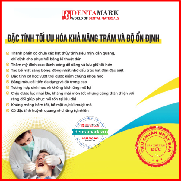 - Thành phần có chứa các hạt thuỷ tinh siêu mịn, cản quang, chỉ định cho phục hồi bằng kỹ thuật dán